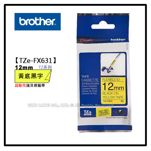 TZe-FX631 12mm BROTHER 黃底黑字 纜線可彎曲護貝標籤機色帶 耗材