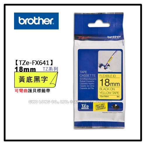 TZe-FX641 18mm BROTHER 黃底黑字 纜線可彎曲護貝標籤機色帶 耗材